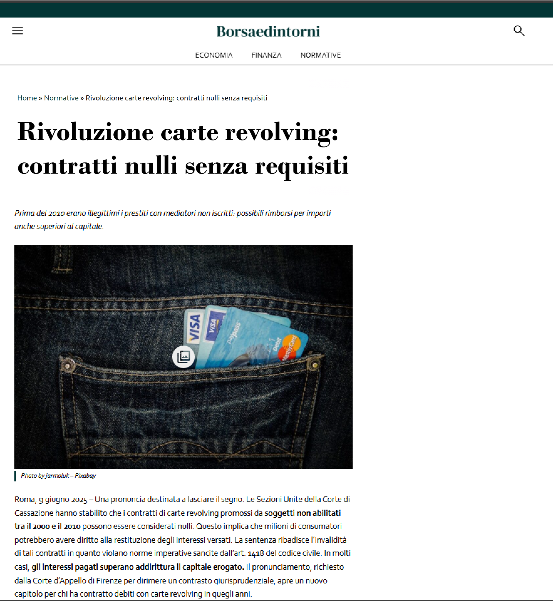 La Corte di Cassazione, a sezioni unite, annulla i contratti di carte revolving promossi da soggetti non abilitati. Sono nulli per violazione di norma imperativa, ai sensi dell’art. 1418 del codice civile. Questo significa che i consumatori coinvolti avranno diritto alla restituzione degli interessi pagati.