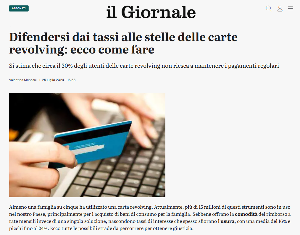 Sono più di 15 milioni le carte di credito revolving in circolazione in Italia, utilizzate spesso per dilazionare i pagamenti di beni di consumo familiari. Comode per i rimborsi rateizzati, nascondono però insidie: i tassi d’interesse medi si aggirano intorno al 16%, con punte che superano il 24%, arrivando spesso a sfiorare l’usura. Scopri tutte le strade percorribili per ottenere giustizia.